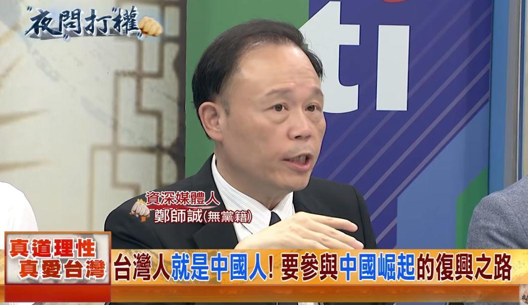 台湾资深人媒体人郑师诚则在节目中表示,岛内政治人物只要提到“中国人”这几个字,就会被攻击“亲中卖台”、“思想里有红色成分”、“一定收了大陆的好处”,他感叹,“我们明明就是一个中国,我们明明就是中国人,但是你就不能讲我是中国人,这是台湾的悲哀。”