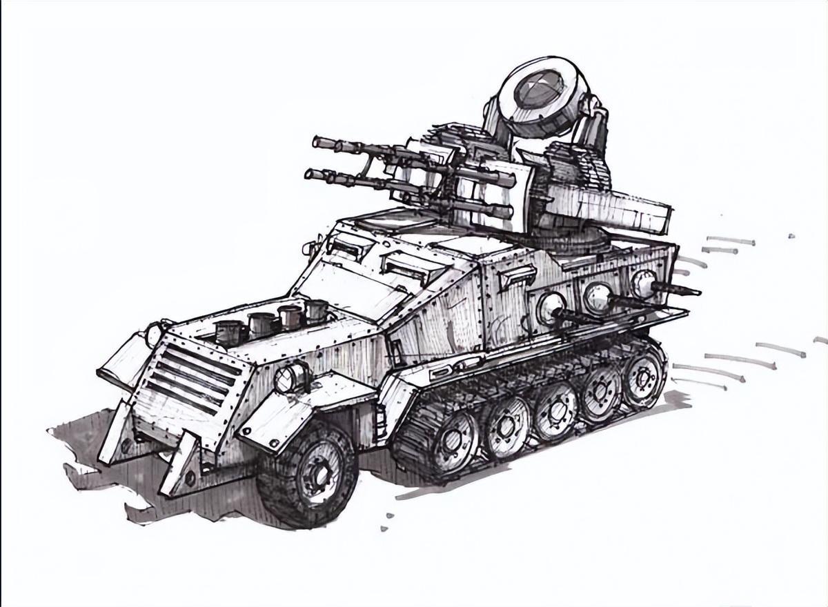 概念图中的防空车安装了8联装机关炮,配有雷达,侧面有6挺机枪。