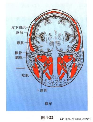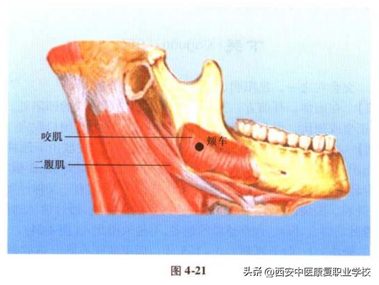 【穴位解剖】 皮肤→皮下组织咬肌。皮肤由下颌神经的下牙槽神经的末支--颊神经分布,该神经与面神经的下颌缘支相交通。针由皮肤经皮下组织,穿咬肌表面的深筋膜进人该肌。营养咬肌的动脉是由上颌动脉分出的咬肌动脉,支配该肌的神经则是由下颌神经发出的咬肌神经(图4-21)。