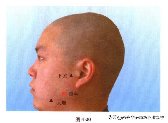 【取法】 正坐或侧卧,如上下齿用力咬紧,有一肌肉(咬肌)凸起,放松时,用手切掐有凹陷,此处是穴(图 4-20)。