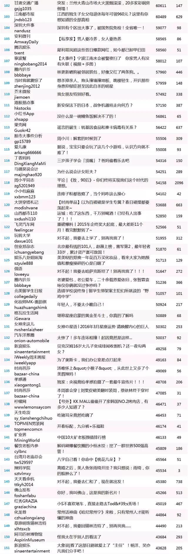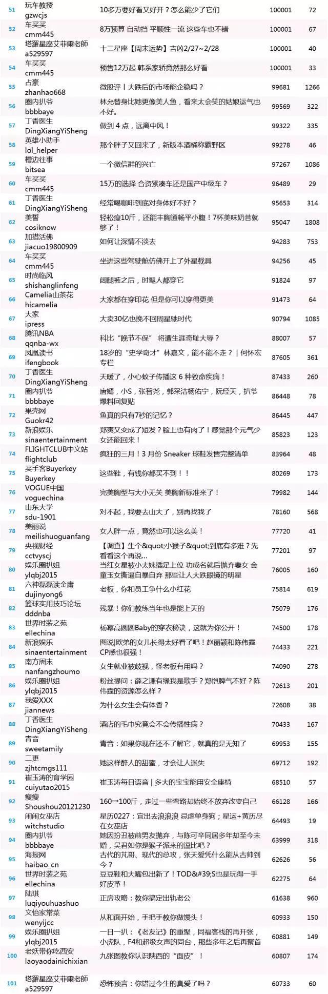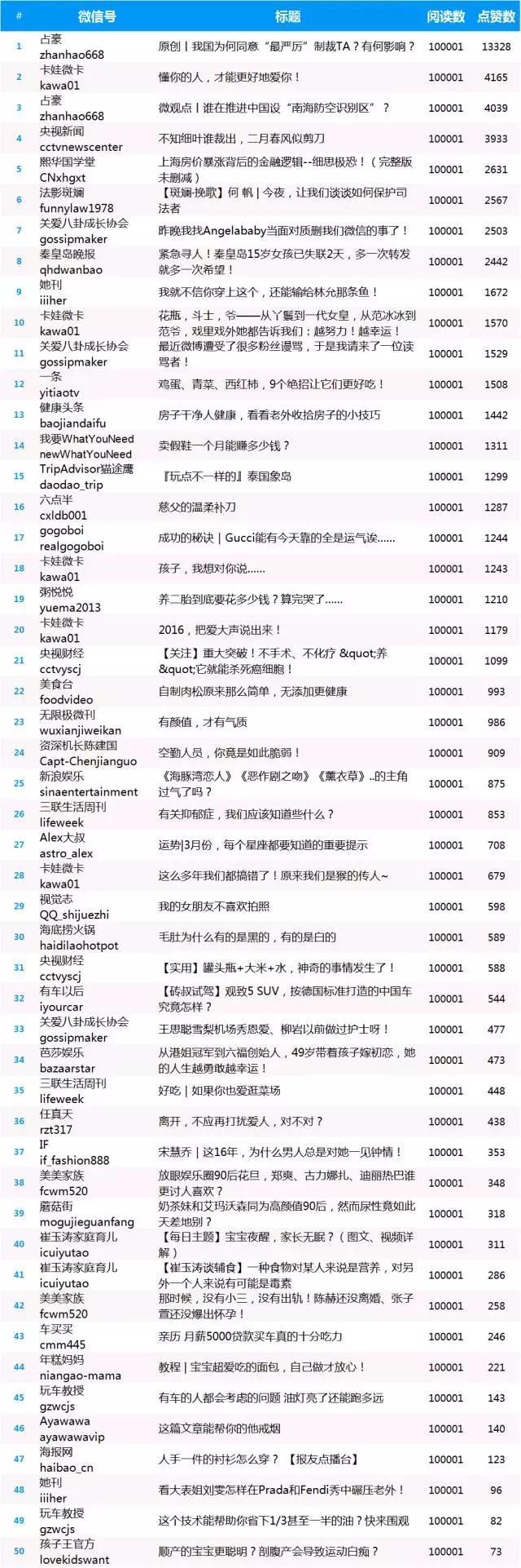 昨天的原创热文中共54篇超十万阅读量的文章,原创热文200强总阅读量达到1356万(超十万阅读数以十万计),总点赞超10万。小新粗略计算了一下,平均点赞率为0.0076哦。“占豪”的文章《原创丨我国为何同意“最严厉”制裁TA?有何影响?》获得阅读和点赞双料冠军,点赞数为13328,远超点赞排名第二的文章《懂你的人,才能更好地爱你!》,此文由“卡娃微卡”发布,点赞量为4165。“圈内扒爷”、“新浪娱乐”、“爱儿康”、“时尚芭莎”等公号各有多篇文章入选原创热文榜,良心微信公号有么有呀!(点击图片可查看清晰原图)
