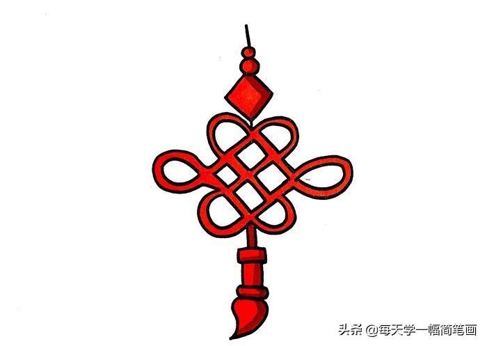 首先我们画出一串吊饰,接着在菱形的下方画上中国结的形状,中间是一个田字形状的方形,边缘有花边,下方再画上流苏装饰,最后就是涂色了,给中国结涂上大红色,简单的中国结简笔画就完成了。