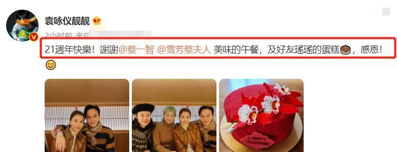 此前,张智霖和袁咏仪分别在社交平台晒出甜蜜合照,庆祝两人结婚21周年。