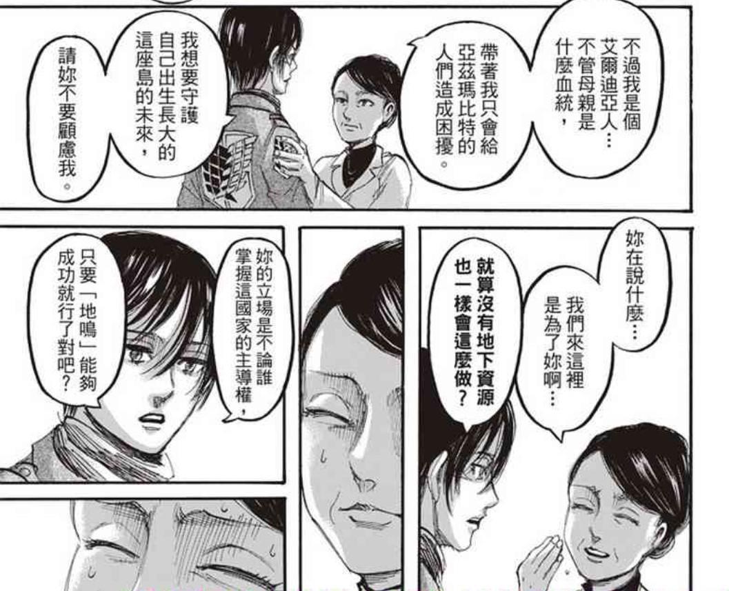 可惜失败了,然后三笠等调查兵团的人被迫执行了艾伦的部分计划,艾伦在和平谈判失败后,就潜入马莱帝国的艾尔迪亚人集中营,那里在举办全球领导人会议,艾伦变身成为巨人解决了这群领导人,向全世界宣战,三笠那时是作为保护艾伦离开的人,并且帮助艾伦获得了战锤巨人。