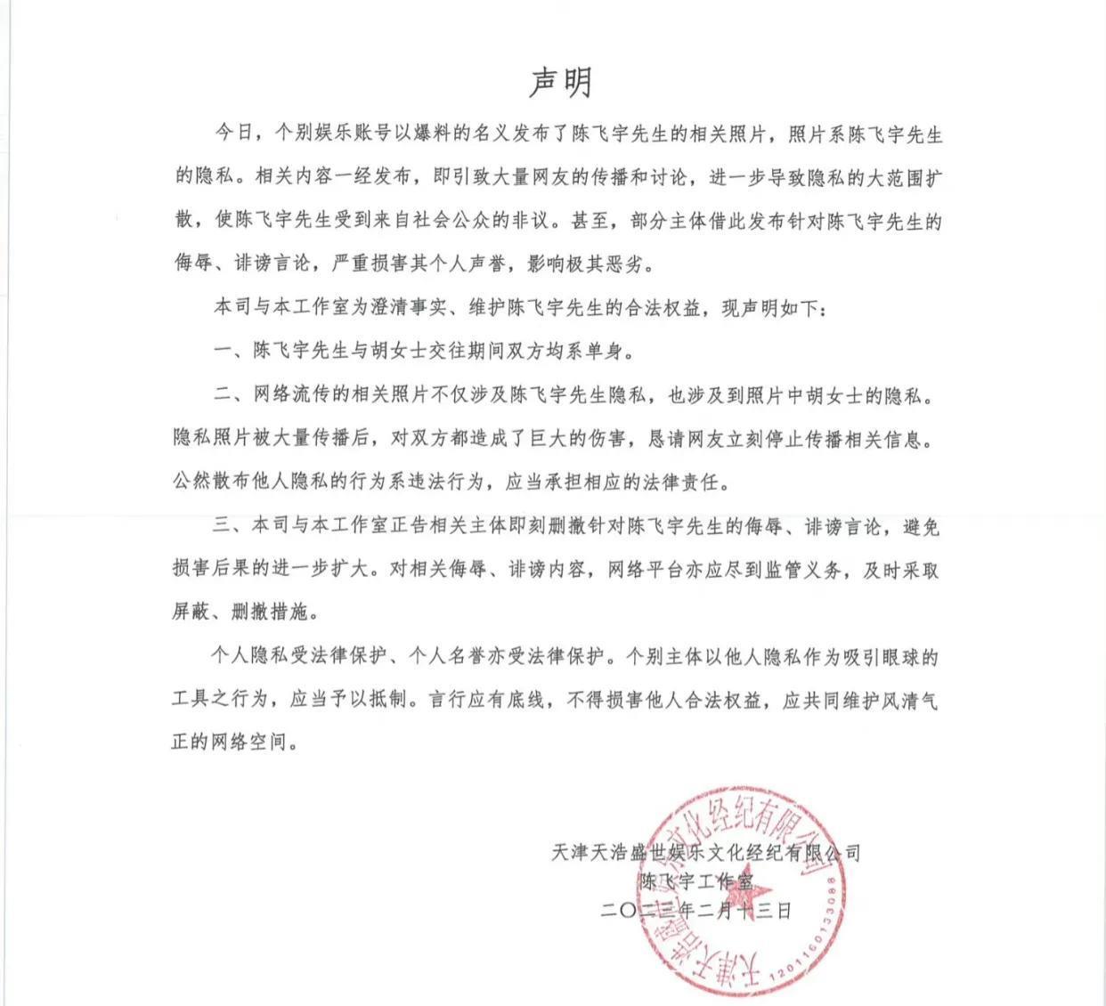 另外,特别恳请大家不要传播照片,毕竟那是个人隐私……这样一来,就是陈飞宇大方承认照片中的人是他本人无疑了。