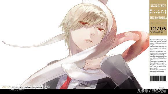 神乐坂四季,为乙女向游戏以及动画《Starry☆Sky / 星座彼氏》男主角之一,星座为蛇夫座。星读科二年级的特待生。具有比不知火一树还要强大的星读能力(预知能力),也很喜欢睡觉,说话语速缓慢而温柔,是守护女主夜久月子的存在。