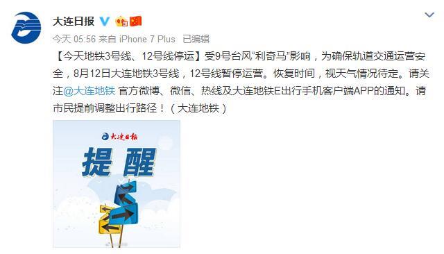 【今天地铁3号线、12号线停运】受9号台风“利奇马”影响,为确保轨道交通运营安全,8月12日大连地铁3号线,12号线暂停运营。恢复时间,视天气情况待定。请关注@大连地铁 官方微博、微信、热线及大连地铁E出行手机客户端APP的通知。请市民提前调整出行路径!(大连地铁)