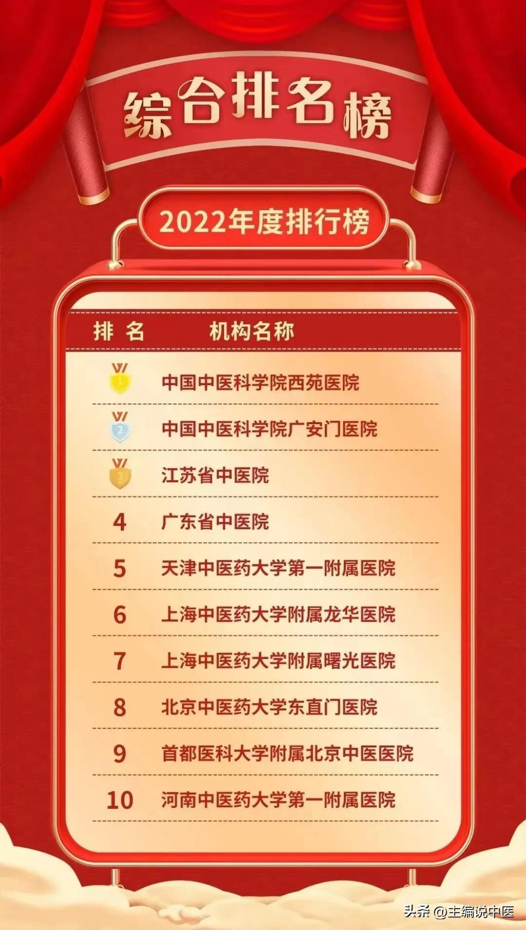 中华中医药学会和中国中医科学院2023年2月19日在北京共同召开了《2022年度中医医院学科(专科)学术影响力评价研究报告》发布会。这次会上发布了对全国610家中医医院、26个中医学科(专科)学术影响力的综合评价。你想知道全国中医医院哪家最强吗?那可以看看这个榜单。报告显示,学术综合影响力排名在前十位的是:中国中医科学院西苑医院,中国中医科学院广安门医院,江苏省中医院,广东省中医院,天津中医药大学第一附属医院,上海中医药大学附属龙华医院,上海中医药大学附属曙光医院,北京中医药大学东直门医院,首都医科大学附属北京中医医院,河南中医药大学第一附属医院。