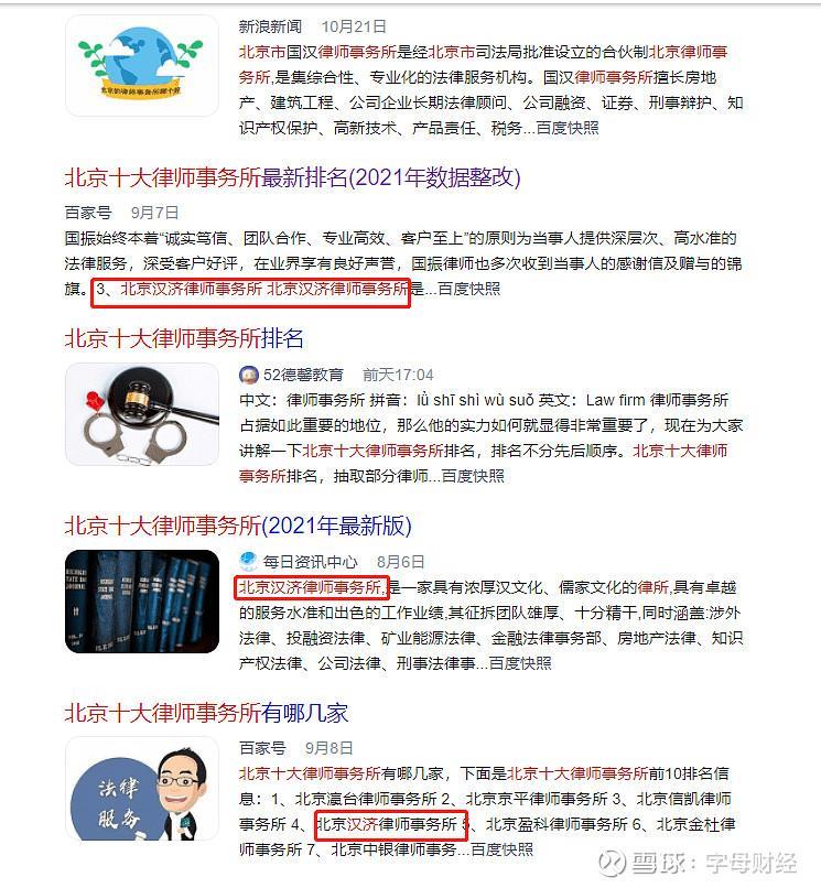 1、2021年8月份,汉济律所出现在“北京十大律师事务所排名”的相关文章中。
