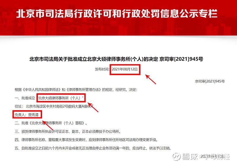 北京市司法局 2021年8月12日 批准设立大硕律师事务所。贾秀清,为该个人所主任,其原为北京恒略律师事务所的合伙人、律师。