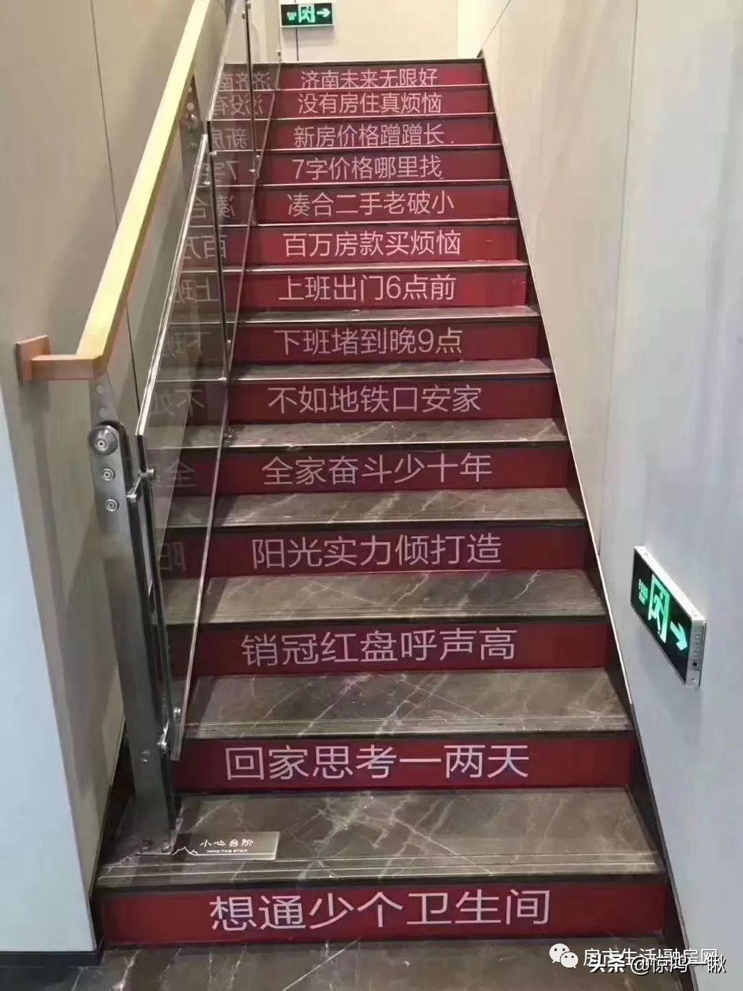 长清恒大绿洲并非个例,一度以地铁线做宣传的阳光城丽景公馆项目的宣传文案中,项目起价也已经低至7700元/㎡了。更有趣的是,项目售楼处的楼梯宣传语也被打造成网红产品出街了。