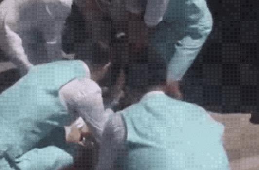 几位伴郎试图搬起柳岩丢进泳池,