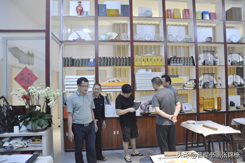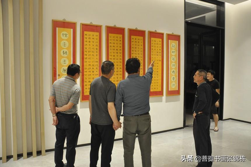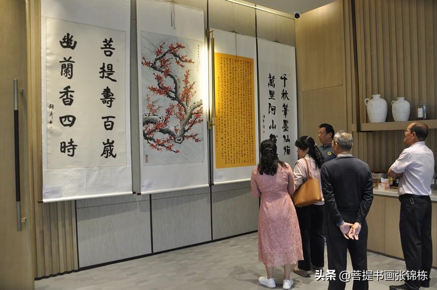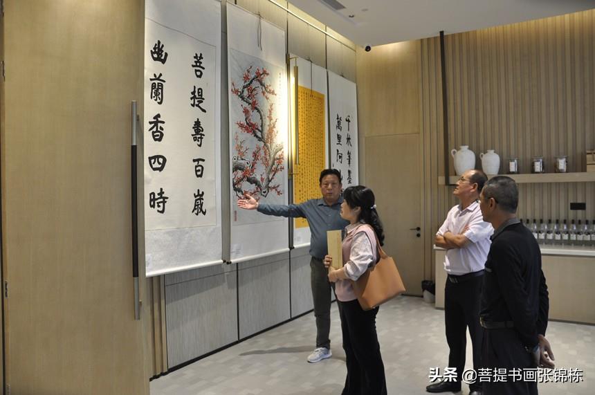 菩提书画院张锦栋院长向前来参加参观的唐校长和盘老师等人介绍洪秋萍老师的书法作品。洪秋萍,国家一级美术师,西城区美术家协会会员,菩提书画院特聘画家,缘惜阁书画院理事,中国国典书画院院士,东方艺术天地顾问,著名花鸟画家王绍华老师入室弟子。