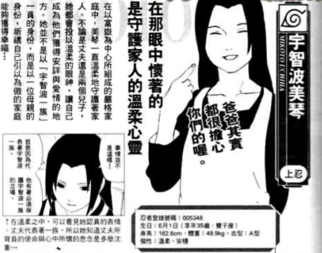 宇智波富岳的妻子,是一位非常温柔的女士,对小儿子佐助尤其宠爱。