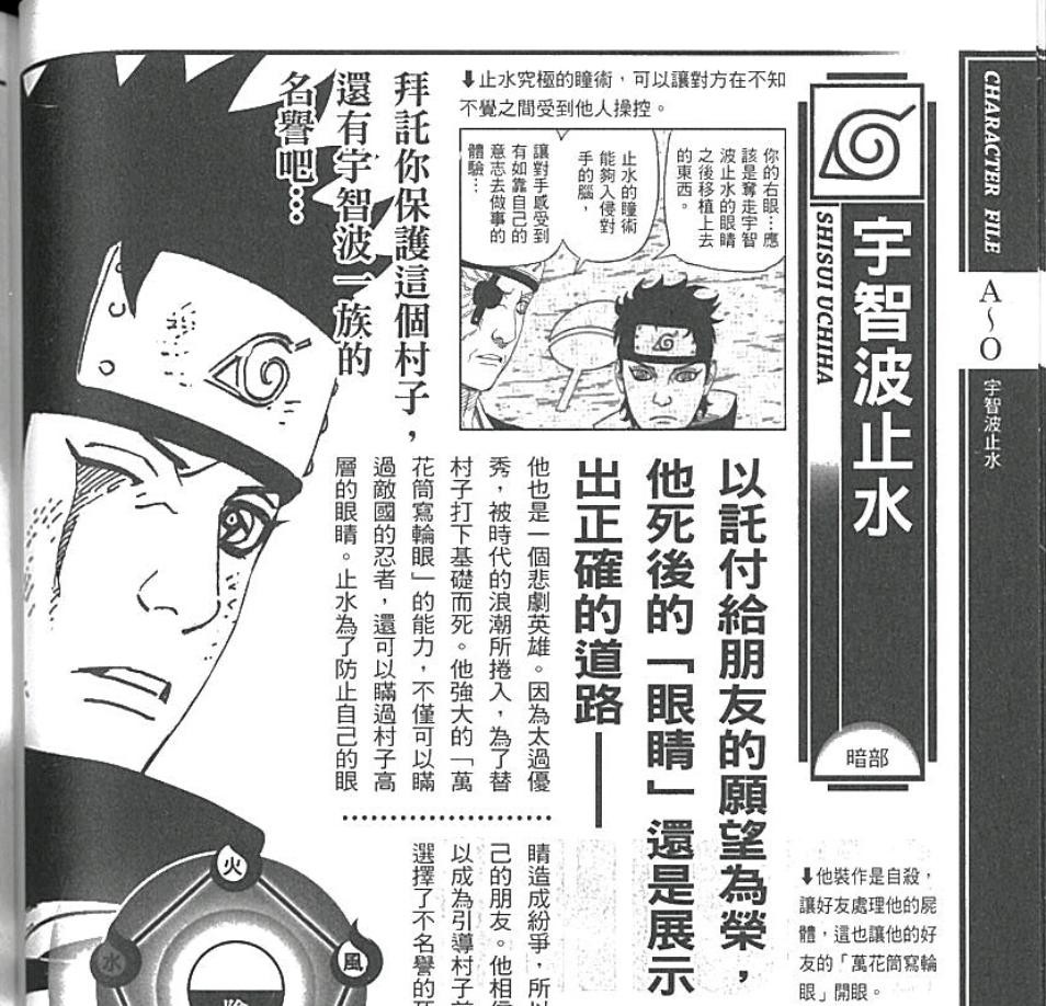 宇智波富岳的儿子,8岁便拥有火影式思维的异才,为了守护木叶独自执行了屠杀宇智波一族的任务,之后加入晓组织内担任卧底。