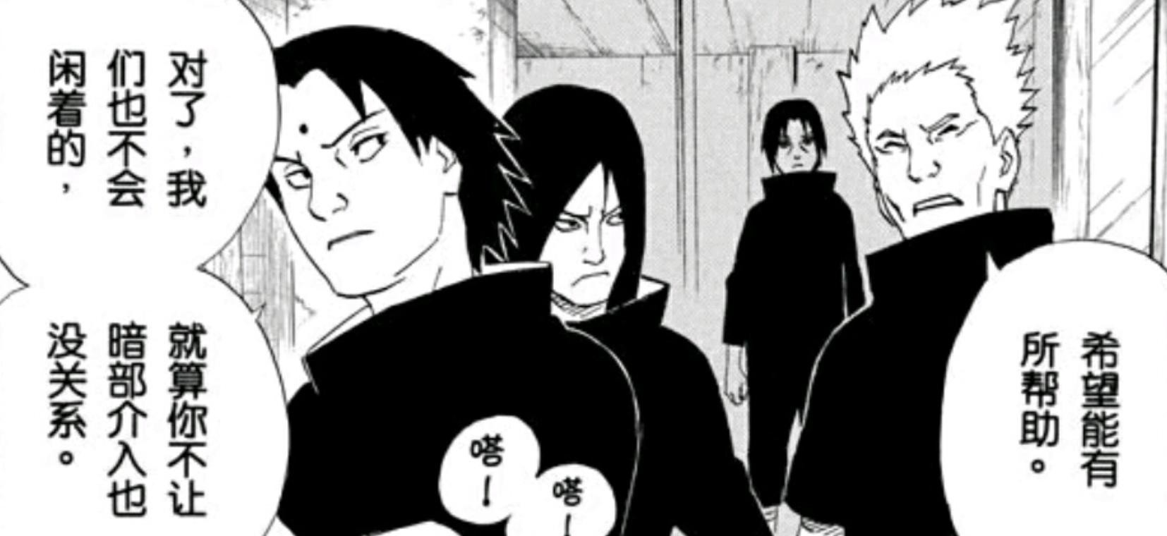 三人都是宇智波一族的上忍,属于宇智波一族的激进派,在止水死后,他们三个组队上门盘问宇智波鼬,被鼬评价为“没有器量”。