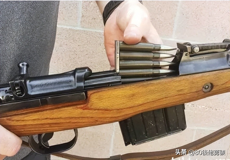 该步枪在使用5发弹夹在不拆卸弹匣的前提下装填弹药的画面