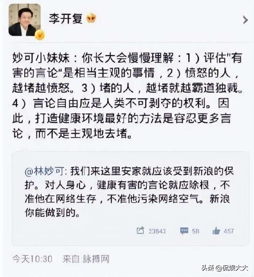 这次事件甚至引来了李开复的关注,他表示:“妙可小妹妹,你长大会慢慢理解:评估‘有害言论’是相当主观的事情……愤怒的人,越堵越愤怒。”