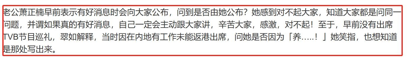 黄翠如缺席《我有我女程》综艺,主持人冯盈盈当着萧正楠的面打趣:“你没理由不知,翠如要她好好养……精蓄锐。”差点说漏嘴,后来冯盈盈又道歉说指自己跟稿读,也跟萧正楠说了抱歉。看来TVB上上下下都知道黄翠如怀孕,并且想拿来搏一搏热度。