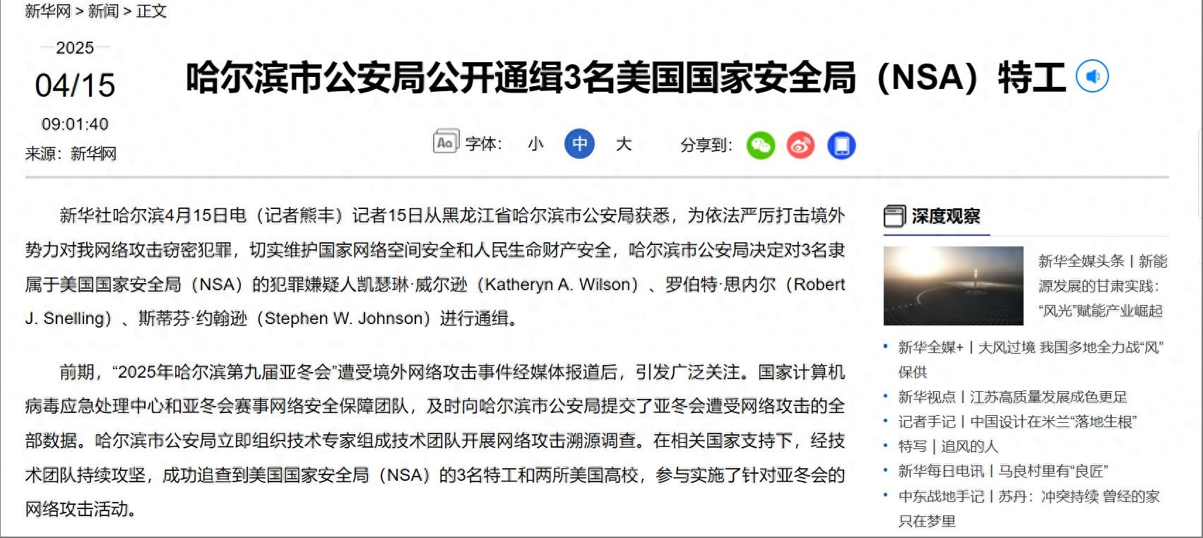 新华社消息,4月15日哈尔滨公安局公开通缉,3名美国国家安全局特工,他们和两所美国高校一起,参与实施了针对2025年哈尔滨亚冬会的网络攻击活动。哈尔滨市公安局表示,请广大群众积极提供线索,凡向公安机关提供有效线索的举报人,以及配合公安机关抓获有关犯罪嫌疑人的有功人员,公安机关将给予一定金额的奖励。这说明三名美国特工,目前很有可能在我境内,或者境内有“第五纵队”分子,协助这些美国特工进行网络攻击。