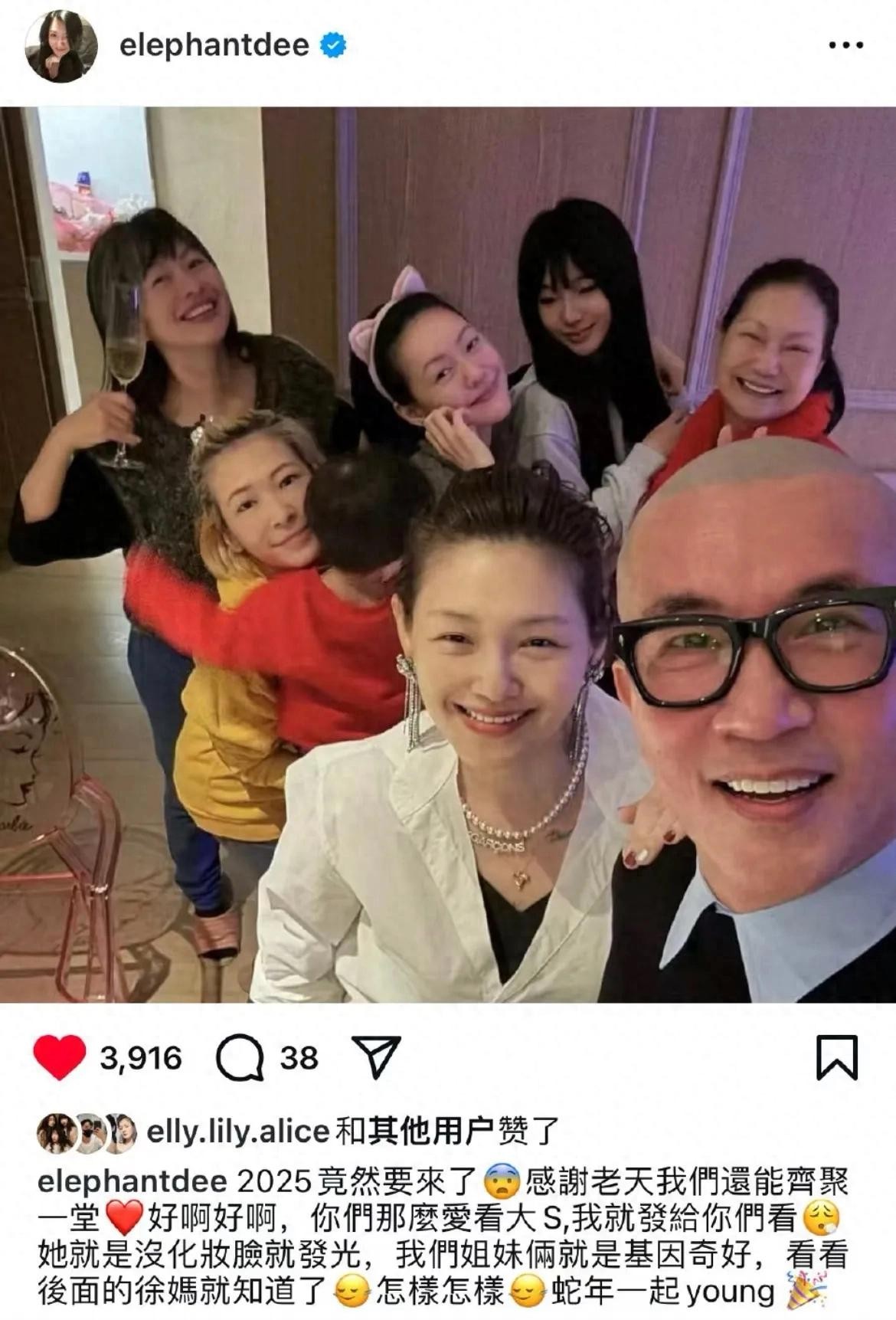 12月31日跨年夜,小s在社交平台分享了一张大合照,照片中出现了她大女儿许曦文、妈妈黄春梅、闺蜜Makiyo和非常受关注的大s具俊晔夫妻。