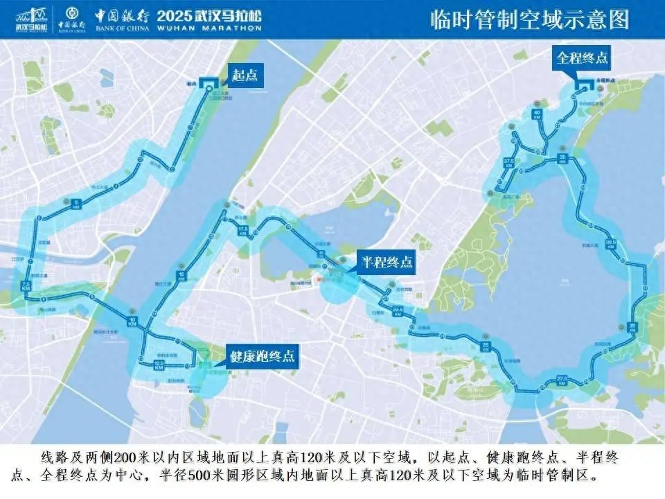 2025年3月23日0:00至14:00,区域为:2025年武汉马拉松跑道线路及两侧200米以内区域和以起点、三个终点(首义广场、松竹路、华侨城欢乐谷)为中心半径500米以内圆形区域真高120米及以下空域。
