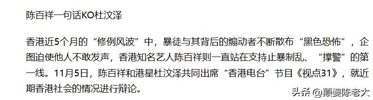 2019年香港爆发“修例风波”,这又给了杜汶泽一个“表演”的机会,他再次跳出来公开支持乱港分子并在一档综艺节目中与艺人陈百祥发生激烈争执。