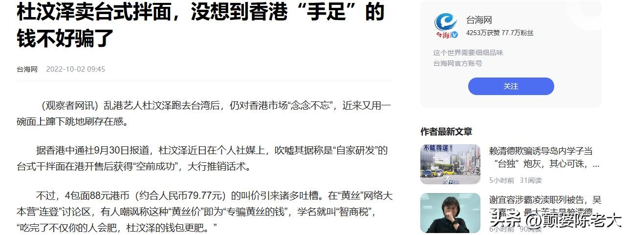 信息来源:台海网——杜汶泽卖台式拌面,没想到香港“手足”的钱不好骗了