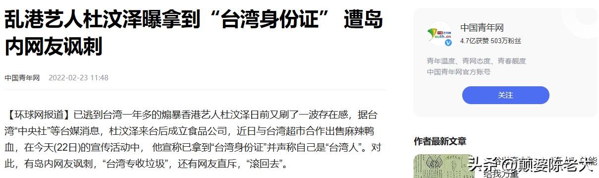 信息来源:中国青年网——乱港艺人杜汶泽曝拿到“台湾身份证” 遭岛内网友讽刺