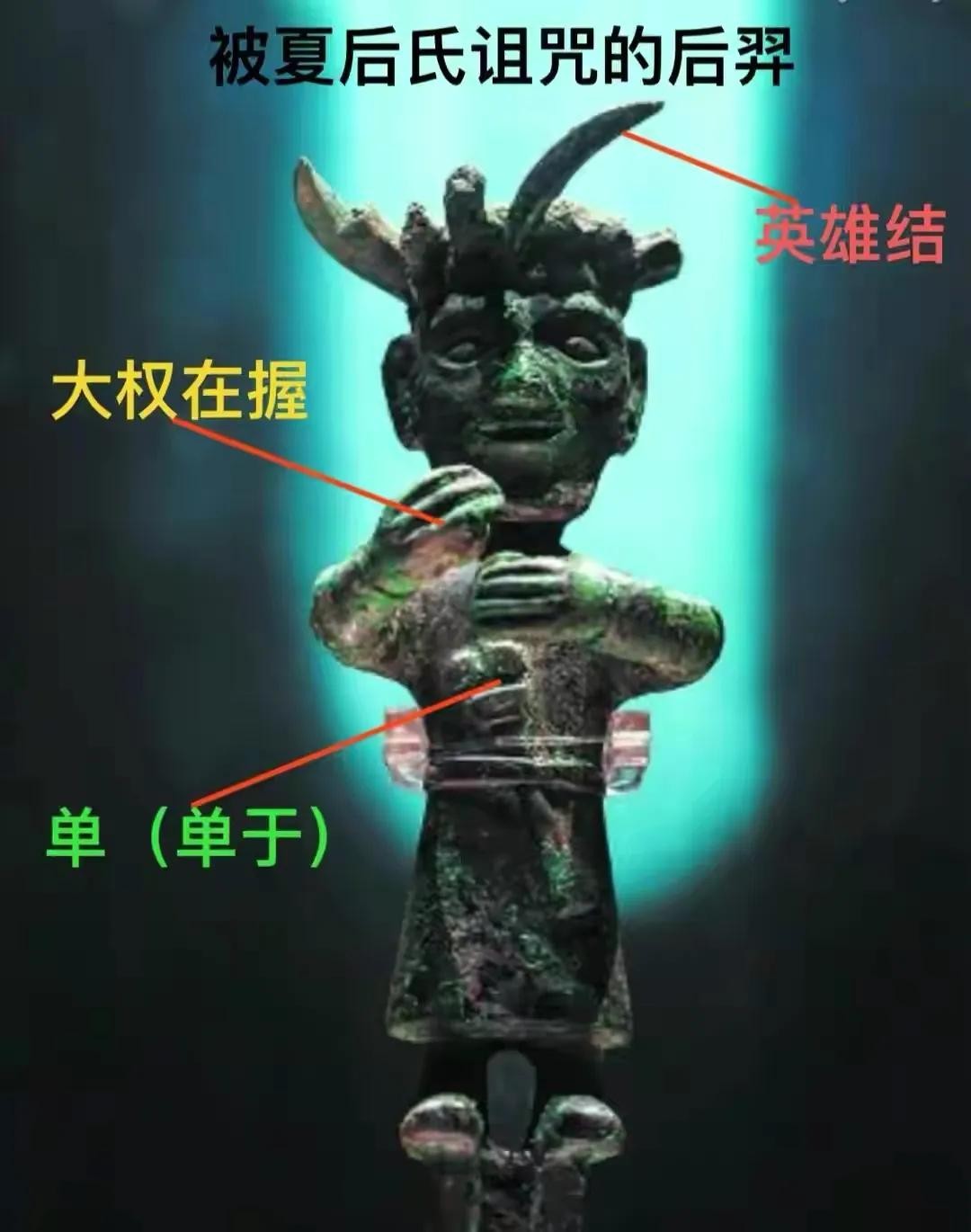 金沙遗址出土的青铜小立人,是被夏后氏诅咒的后羿,因为后羿砸毁了三星堆,篡夺了太康的王位,迫使夏后氏的人逃往金沙遗址。(可以参考我的文章《“后羿射日”与三星堆的毁灭》)