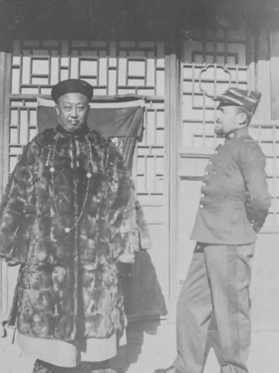 直隶某地官员与八国联军军官合影。右边的洋军官侧对镜头,一副趾高气扬的样子。