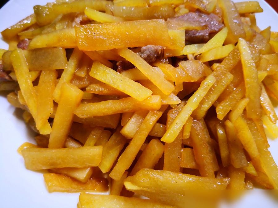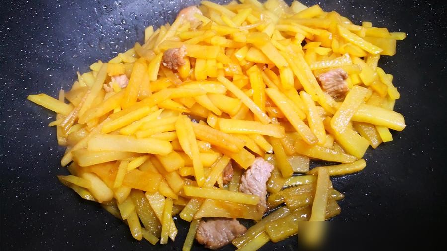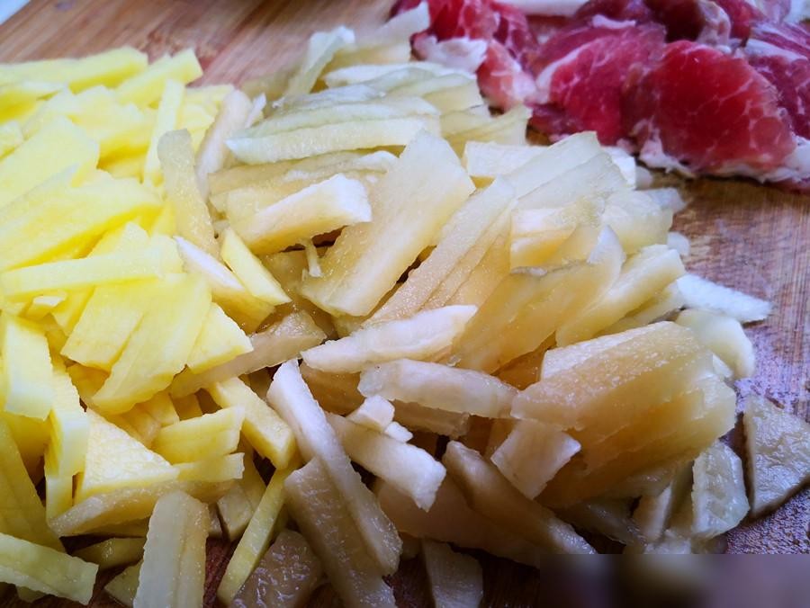 四分之一土豆、一半雪莲果加上一片猪肉进行炒制。