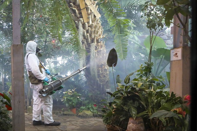 3月25日,在俄罗斯莫斯科,一名工作人员为植物园的树木消毒。新华社/美联