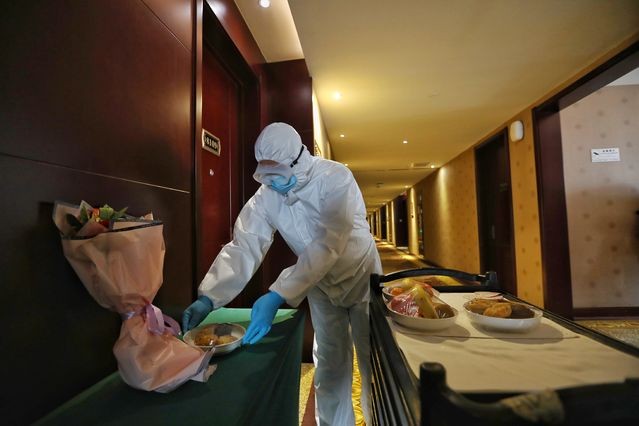 3月24日,北京市顺义区某入境集中观察酒店,工作人员赠送鲜花点心给留观人员。截至3月24日12点,该区4家入境集中观察酒店共接待461人,其中外籍105人。中青报·中青网记者 李建泉/摄