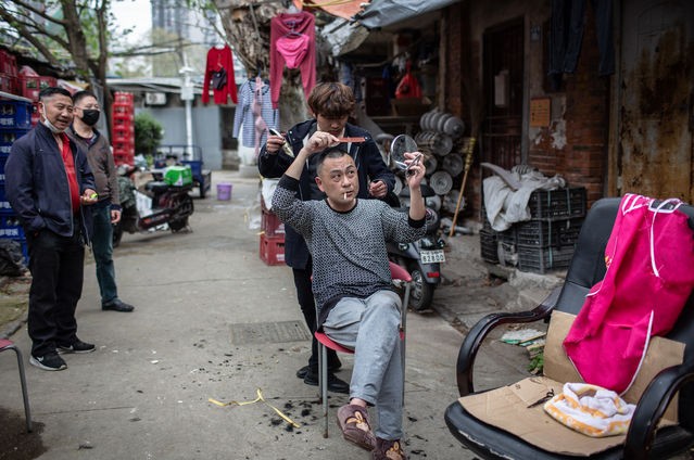 3月24日,武汉市江汉区汉来广场附近的小区内,一名居民在理发。这附近是武汉规模较大的一家建材市场,聚集了许多外地商户、租户。中青报·中青网记者 李峥苨/摄
