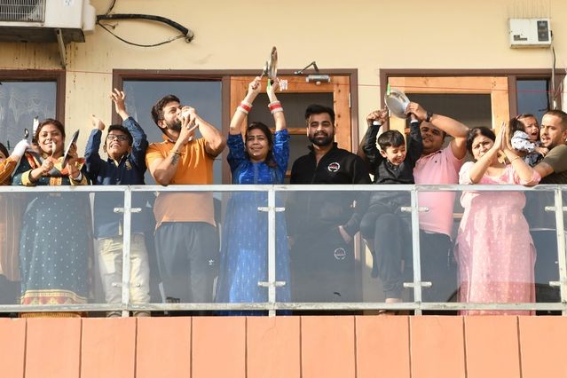 3月22日,在印度阿姆利则,人们在阳台上向抗击疫情的医务人员和其他工作人员致敬。当日,印度民众响应总理纳伦德拉·莫迪呼吁,走上阳台或屋顶,敲打锅碗瓢盆或鼓掌,向抗击新型冠状病毒疫情的医务人员和其他工作人员致敬。新华社/法新
