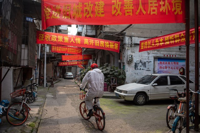3月24日,武汉市大董社区,一名下沉干部骑着共享单车穿行在社区里。中青报·中青网记者 李隽辉/摄