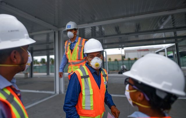 3月24日,在巴拿马首都巴拿马城,工人参与方舱医院建设。为及时收治新冠肺炎患者,巴拿马城开始建设一家模块化的方舱医院,建成初期将可容纳100张床位。新华社/法新