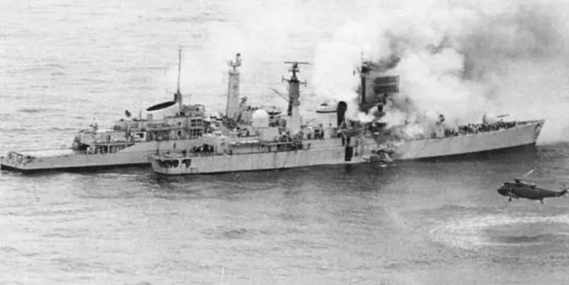 ▲正在燃烧的“谢菲尔德”号驱逐舰,旁边是转移船员的“箭”号护卫舰,近处还有一架赶来支援的直升机