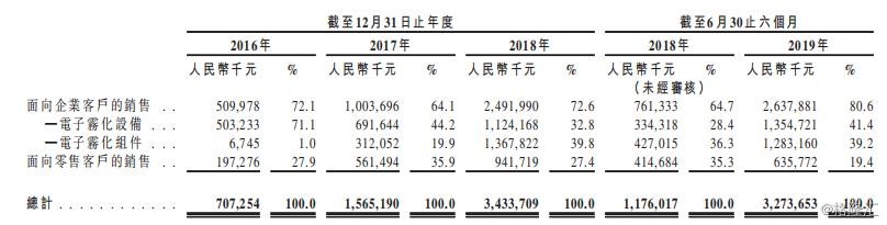 就营收增速而言,2017年、2018年及今年上半年,其营收增速分别为121.3%、119.4%及178.4%,由7.07亿元增至今年上半年的32. 74亿元,主要是由于客户引入新产品导致公司产量增加,业客户、APV分销商规模扩大,以及有关配备陶瓷加热技术的电子雾化设备订单增加,自有品牌APV市场知名度提升所致。