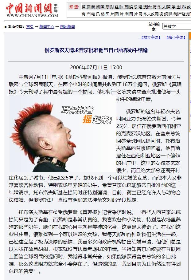 中国新闻网:俄罗斯农夫请求普京批准他与自己所养奶牛结婚