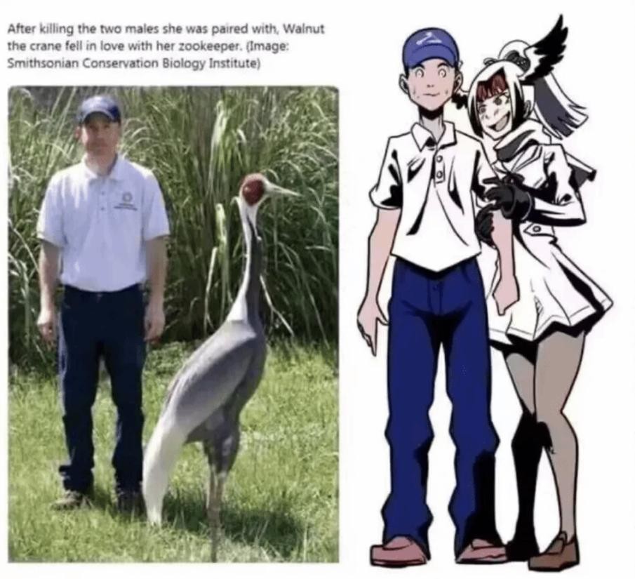 2005年,美国史密斯生物保护学研究所里的一只雌鹤突然在一位男性饲养员克里斯·克罗的面前跳起了代表求偶的鸟类动作。