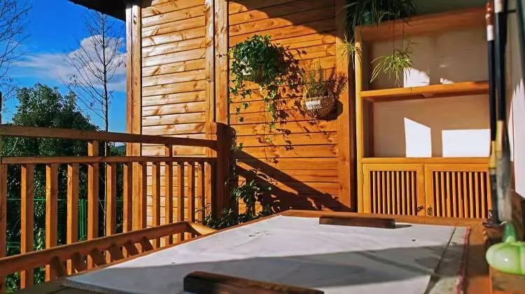 旁边的走廊是通往房间的,也是木制设计,沿着走廊一路前行有个小荷塘。最令严选官惊喜的是这里的后花园,绿油油的草坪还有休闲木椅,不仅可以休息聊天还可以拍照打卡,也是宝爸宝妈们带小朋友或者萌宠撒欢的不错选择哦~