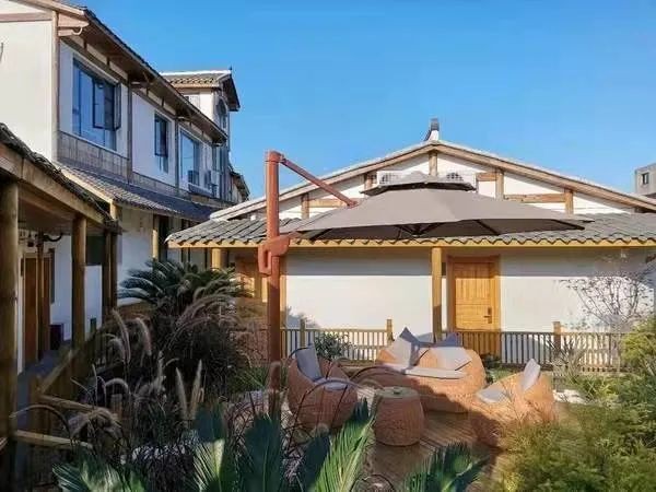 进了大门会看到左边是户外休息区,小庭院有假山和很多花花草草,沙发区很适合三两好友坐着聊聊天,喝喝茶,非常惬意。