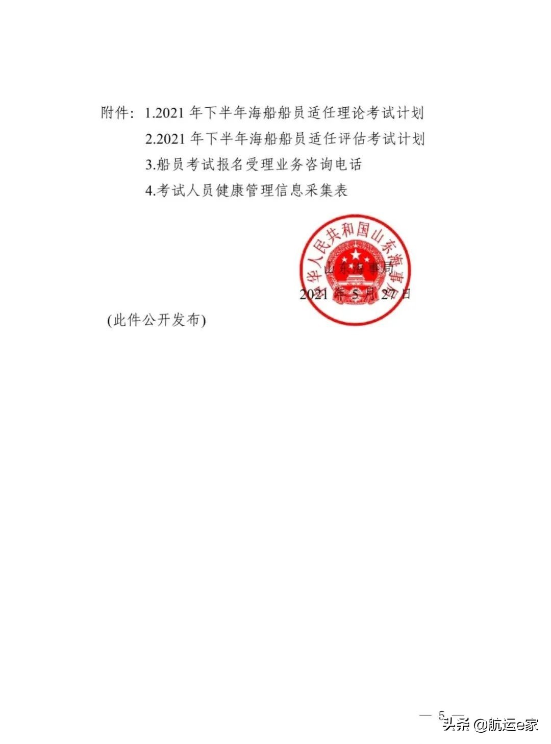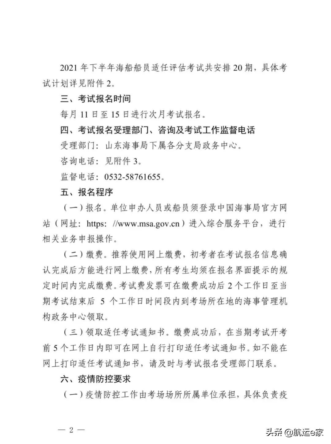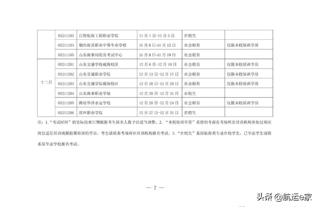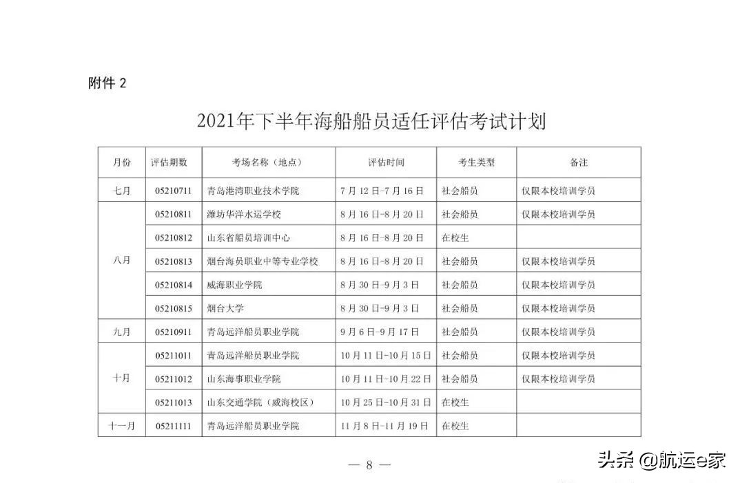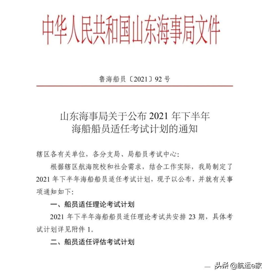山东海事局关于公布2021年下半年海船船员适任考试计划的通知