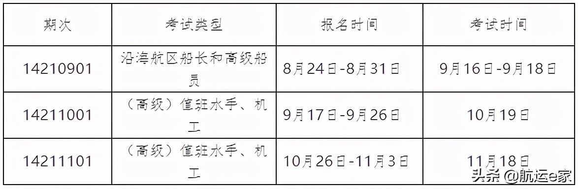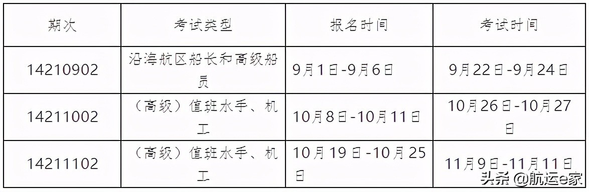 2021年下半年分别安排9期海船三等及以上船舶船长和高级船员适任考试。具体报名时间、考试时间及考试地点等见附件不清楚可以私我。