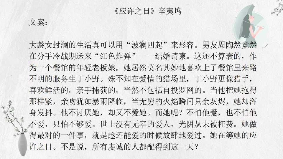 辛夷坞的文字充满青春的伤痛和现实主义,阅读后回味无穷,怅然若失。喜欢甜文和一生一世一双人的小伙伴慎入!