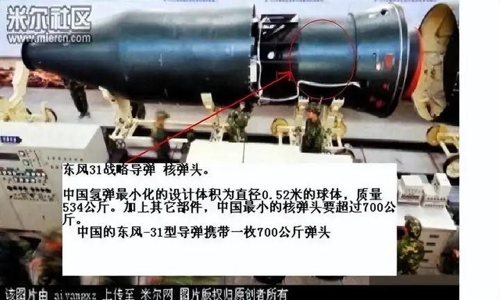 可以清晰的看见中国最新式的东风31战略导弹核弹头(红圆圈所标式)