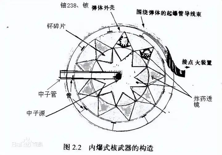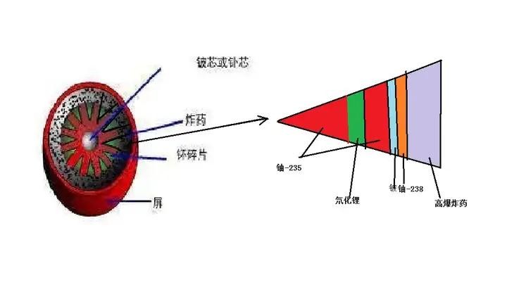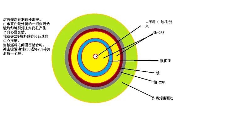 。原理是利用中心的铀235释放出的中子诱发外边的铀235开始发生剧烈的链式核裂变,释放出X射线向球心聚焦, 让它集中能量去激发聚变材料,获得聚变所需的上千万度高温及高压。再利用聚变反应释放出的高能量中子导致反射层铀-238碎片裂变。