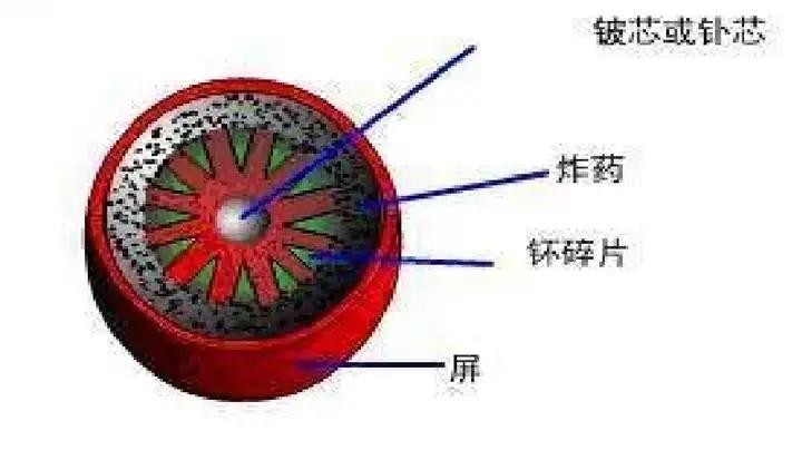2、从里往外依次是铀-235层 5厘米厚9公斤、氘化锂(燃料)3厘米厚1.5公斤、钚239层4厘米厚96公斤,铍1厘米厚3.6公斤。